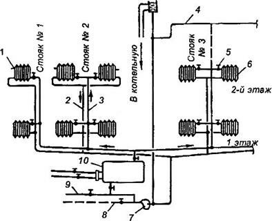 Рис. 5.2. Схема двухтрубной системы водяного отопления с насосной циркуляцией и нижней разводкой, присоединенной теплосети через бойлер: