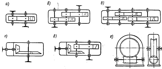 По числу передач, входящих в редуктор, различают одно-, двух-и многоступенчатые редукторы. Одноступенчатые цилиндрические редукторы } позволяют получать передаточные числа <10, двухступенчатые—<60, трехступенчатые— и > 60, одноступенчатые конические редукторы—<6,3, одноступенчатые червячные— и > 30. Для получения больших передаточных чисел и передачи дви­жения между пересекающимися быстроходным и тихоходным вала­ми применяют комбинированные редукторы, включающие различ­ные виды передач — коническо-цилиндрические, червячно-зубчатые, планетарные и др. Червячные редукторы обычно выполняют одноступенчатыми. Передаточное число двухступенчатых или трехступенчатых редукторов равно произведению передаточных чисел каждой пары.