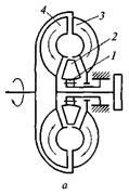 Гидродинамические передачи. Представителями гидродинамических передач являются гидротрансформаторы реже гидромуфты. Гидромуфта состоит из насосного 2 (рис.17.) и турбинного 3 колес, посаженных соответственно на ведущий 1 и ведомый 4 валы. Внутренние полости обоих колес разделены лопатками. При вращении насосного колеса рабочая жидкость за счет центробежных сил устремляется на периферию, вследствие чего в периферийной части создается повышенное давление, способствующее перетеканию жидкости в полость турбинного колеса, а в расположенной ближе к центру части создается разрежение, способствующее