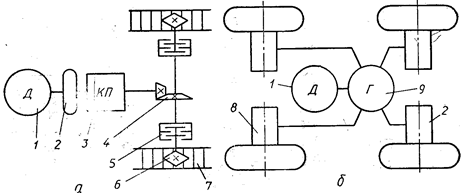 а — гидромеханического; б — дизель-электрического; 1 — двигатель (дизель); 2 — гидротрансформатор; 3 — коробка передач; 4 — главная передача; 5 — бортовой фрикцион; 6 — ведущая звездочка; 7 — гусеница; 8 — мотор-колеса; 9 — генератор постоянного тока