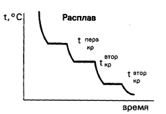 На кривых охлаждения (рис. 5.1) эти температуры отмечены горизонтальными участками, так как процесс кристаллизации идет с выделением тепла,  поэтому в момент аллотропных превращений и первичной кристаллизации понижение температуры  в  системе  не происходит.