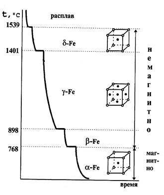 9) Поясните  на  кривой охлаждения чистого железа его аллотропные превращения.