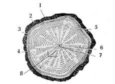 КАМБИЙ (4) - слой живых клеток.  Ежегодно в вегетационный период камбий откладывает в сторону коры клетки луба, а внутрь ствола в значительно большем объеме  клетки  древесины. Деление клеток камбия начинается весной и заканчивается осенью, поэтому древесина состоит из ряда концентрических слоев.