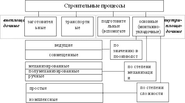 1. Технология строительных процессов определяет теоретические основы, методы и способы выполнения строительных процессов, обеспечивающих обработку строительных материалов и полуфабрикатов с качественным изменением их состояния с целью получения конечной продукции (здания, сооружения). Строительные процессы классифицируют в две группы – внеплощадочные и внутриплощадочные (рис. 1):