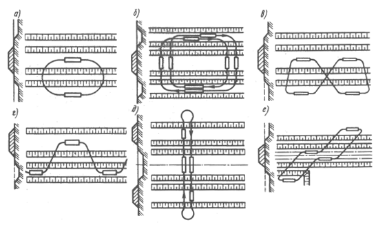 Разработка выемок скреперами ведется поперечным или продольным способом в зависимости от направления движения скрепера (вдоль или поперек). Применяют следующие схемы движения скреперов: