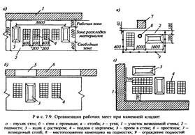 При выполнении каменной кладки производительность труда каменщиков зависит от организации рабочего места (рис. 7.9), исключающей не относящиеся к процессу движения рабочих, и обеспечивающей минимальные расстояния перемещения кирпича и раствора от места складирования к месту укладки.