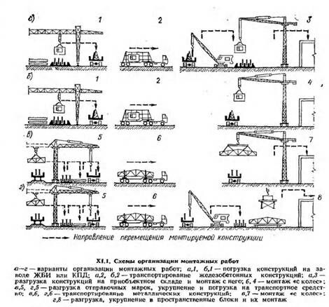Могут иметь место следующие варианты организации монтажных работ: доставка конструкций с завода или площадки укрупнительной сборки и предварительное складирование их на объекте в зоне действия монтажного крана этот вариант является следствием особых условий или недостаточно четкой организации монтажных работ (рис. ХI. 1,а);