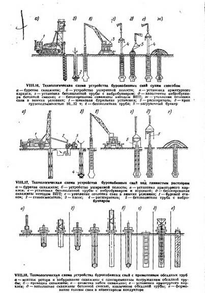 Устройство буронабивных бетонных и железобетонных свай. Характерной особенностью технологии устройства буронабивных свай являются предварительное бурение скважин до заданной отметки и последующее формирование ствола сваи.