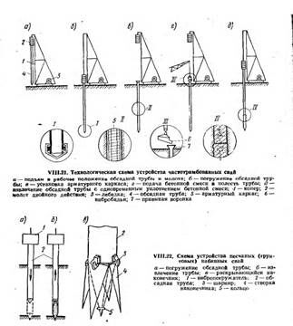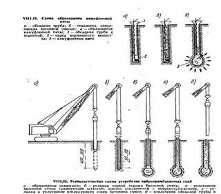 Вибротрамбованные сваи (рис. УIII. 20) используют в сухих связных грунтах, в которых можно укладывать бетонную смесь в открытую скважину глубиной 4...6 м.