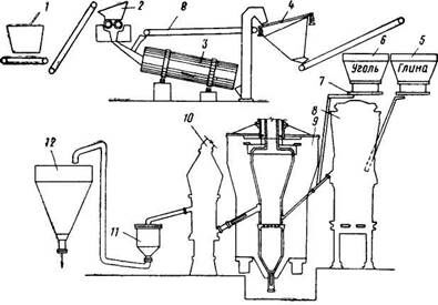 Глину подают в ящичный подаватель 1, из которого она поступает в вальцы грубого помола 2. Дробленую глину направляют в су­шильный барабан 3, где она подсушивается до влажно­сти 7…9% и одновременно измельчается подвешенными в нем цепями. Подсушенную и измельченную глину подвергают про­севу на грохоте 4. «Проход» через сито направляют в расход­ный бункер 5, а «отказ» возвращают в сушильный барабан для досушки и домола. Иногда в глину добавляют уголь, ко­торый хранится в расходном бункере 6. Глину и уголь тарель­чатыми питателями 7 подают в печь термоподготов­ки 8. Здесь она подогревается и самотеком попадает в реактор обжига (вспучивания) 9. Сюда через нижнюю (подовую) решет­ку поступают горячие газы из мазутной или газовой топки. Вспученный керамзитовый песок самотеком направляется в хо­лодильник 10, также работающий по принципу кипящего слоя.