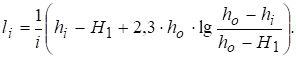 С помощью уравнения (1 – 8) можно решать различные задачи по определению удельного расхода q, одной из глубин H1 или H2, построению (по точкам) кривой депрессии. Если заданы коэффициент фильтрации k, уклон дна водоупора i и глубины H1 и H2 , сначала из уравнения (1 – 8) подбором находят нормальную глубину ho, затем по формуле (1 – 4) удельный расход q. Задаваясь с определенным шагом глубинами hi по формуле (1 – 8), подставляя в нее вместо H2 - hi, находят соответствующие расстояния li и по точкам строят кривую депрессии: