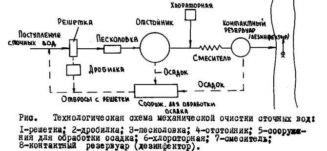 Механический метод используется для удаления из сточных вод только нерастворимых загрязнений. Основными элементами схемы механической очистки сточных вод являются решетки, песколовки и отстойники (рис. 15).