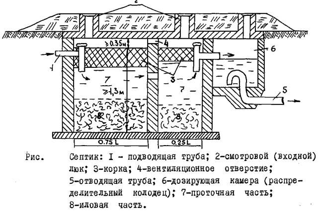 Для очистки сточных вод в районах временного расположения войск, небольших объектов, отдельных зданий и сооружений применяются септики. В септиках (рис. 18), параллельно процессу отстаивания протекают биологические процессы разрушения органических веществ выпадающего осадка.