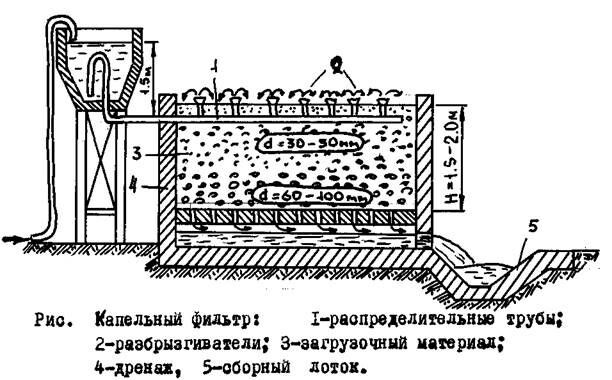 Биологическая очистка сточных вод в искусственных условиях осуществляется в биологических фильтрах (биофильтрах). Биофильтр устраивается в виде прямоугольного или круглого в плане резервуара с двойным дном: нижнее сплошное и верхнее (выше на 0,5 м) – в виде колосниковой решетки. Биофильтр загружается щебнем, керамзитом или галькой прочных горных пород. Сточные воды, прошедшие предварительную очистку в отстойниках, поступают на биофильтр, равномерно разбрасываются по всей его поверхности и фильтруются через слой загрузки. В процессе созревания биофильтра (пуска его в работу) на поверхности частиц загрузочного материала и в их порах образуется биологическая пленка, густо заселенная микроорганизмами. Необходимым условием работы фильтра является поддержание жизнедеятельности микроорганизмов активной пленки путём обеспечения поступления к ней кислорода воздуха (вентиляции), регулирования подачи питательных веществ (сточных вод) и удаления продуктов распада (омертвевшей пленки). Основным типом биофильтров для очистки бытовых сточных вод с расходом не более 1000 м3/сутки является капельный биофильтр (рис. 19).