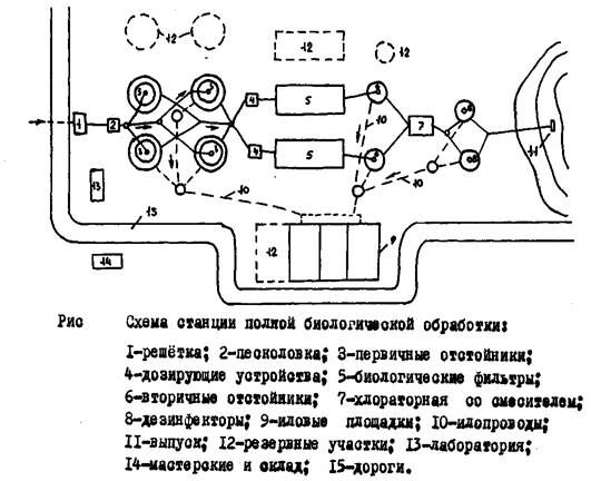 Станции обработки сточных вод представляют собой комплекс сооружений, состав которых и технологическая схема зависят от принятого способа обработки. При выборе состава очистных сооружений должны учитываться местные условия, основными из которых являются климатические и гидрогеологические условия, рельеф местности, наличие свободных площадей для размещения полей фильтрации, возможность и целесообразность устройства полей орошения. Применение биофильтров целесообразно только в случаях, когда по местным условиям, санитарным требованиям или технико-экономическим соображениям нерациональна или невозможна обработка на полях орошения или полях фильтрации.