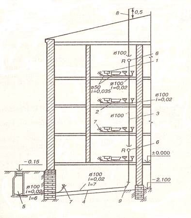 1 – санитарные приборы; 2 – отводные трубы; 3 – стояк; 4 – выпуск; 5 – колодец дворовой канализации; 6 – ревизия; 7 – прочистка; 8 - вытяжная часть стояка; 9 – отвод.