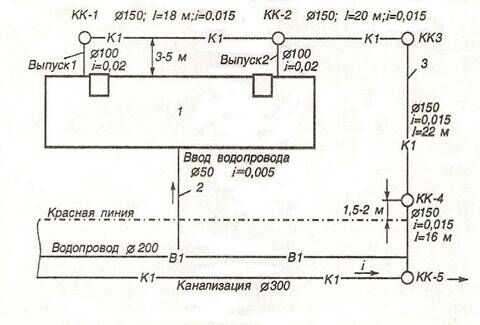 1 – жилой дом; 2 – ввод водопровода; 3 – дворовая сеть водоотведения. КК-1,КК-2 - колодцы дворовой сети; КК-3 – поворотный колодец; КК-4 - контрольный колодец; КК-5 – колодец уличной сети.