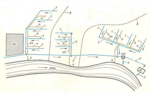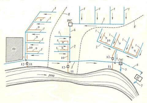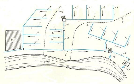 1 – уличные коллекторы бытовой и дождевой сети; 2 – районные (бассейновые) коллекторы; 3 – главный городской коллектор; 4 – напорный районный коллектор; 5 – аварийный выпуск; 6 – напорный коллектор от главной насосной станции к очистным сооружениям; 7 – устройство для выпуска очищенных сточных вод; 8 – водоразделы. ПП – промышленное предприятие; РНС – районная насосная станция; ГНС – главная насосная станция; ОС – очистные сооружения.
