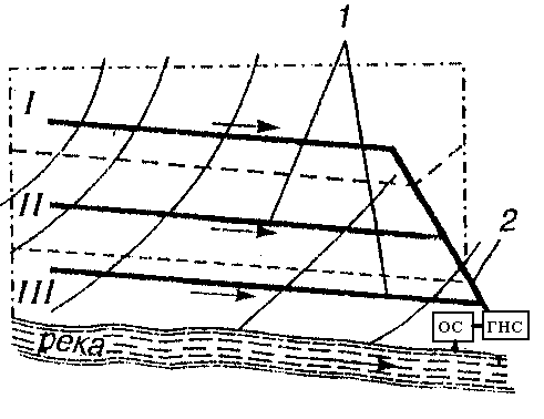 При круто падающем рельефе застройки в направлении реки применяют параллельную схему, рис. 3.6.1. В этом случае районные коллекторы 1 прокладываются в направлении, параллельном реке, а городской 2 – в перпендикулярном направлении. Целесообразность применения данной схемы заключается в предотвращении возрастания скоростей сточных вод в районных коллекторах выше критических значений, способных вызвать разрушения трубопроводов.