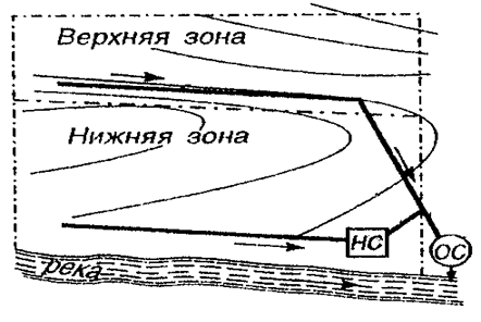 В том случае, если рельеф местности имеет ярко  выраженный характер в направлении реки и затруднена организация самотечного движения сточных вод в пониженной части территории застройки,  применяется зонная схема, рис. 3.6.2.