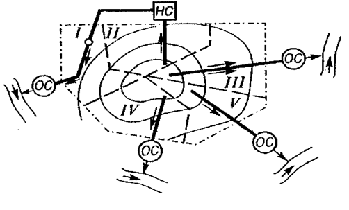 Радиальная схема, рис. 3.6.3, применяется при сложном рельефе, большой территории водоотведения и наличии двух и более очистных сооружений.