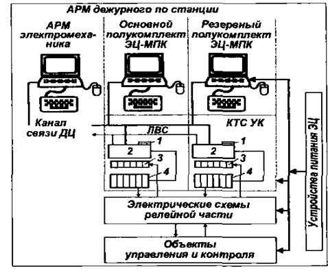 ЭЦ-МПК строится по трехуровневой структуре, показанной на рисунке. Верхним уровнем являются автоматизированные рабочие места дежурного по станции (АРМ ДСП) на базе резервированных ЭВМ и АРМ дежурного электромеханика. Ко второму уровню относится комплекс технических средств управления и контроля (КТС УК). Комплекс состоит из источников питания 1, контроллеров 2, плат контроля 3 и управления 4. Третий уровень включает исполнительные схемы релейной централизации. Выполнение функций, обеспечивающих безопасность движения, возлагается на минимальное число реле I класса надежности.