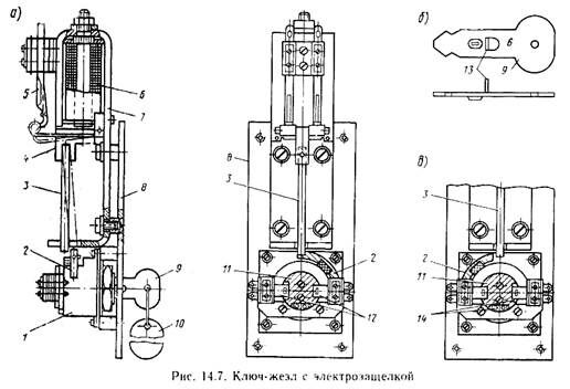 Ключ-жезл 9 (рис. 14.7, а, б и в) представляет собой фигурообразную пластинку с ограничителем 13 и металлической подвеской 10. На металлической подвеске указывается название перегона. На ключ-жезл наносят его серию. Ключи-жезлы разных серий отличаются формой конца пластинки. Ключ-жезл 9 находится в барабане замка 1, связанного с сегментом 2. Настройка барабана замка на серию ключа-жезла выполняется четырьмя спиральными пружинами и восемью металлическими штифтами различной длины. На барабане замка имеется текстолитовая пластинка 11 с двумя контактными металлическими накладками 14, служащая для замыкания и размыкания контактных пружин 12 (1-2 и 3-4).