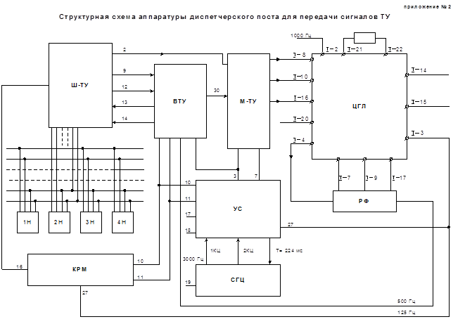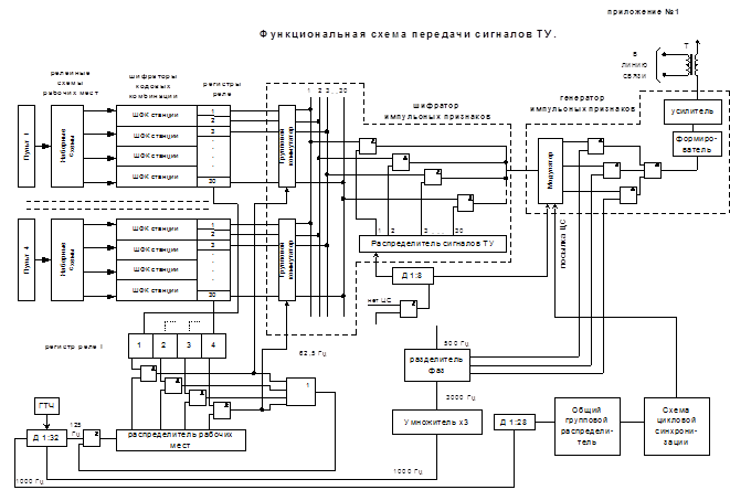 Формирование и передача сигналов ТУ выполняется аппаратурой (см. приложение №2) , содержащей следующие функциональные узлы: генератор сигналов ЦГЛ, разделитель фаз РФ, узел синхронизации УС, счетчик групповых циклов СГЦ, узел включения передачи ВТУ, шифратор Ш-ТУ, коммутатор рабочих мест КРМ, наборные регистры рабочих мест 1Н-4 Н, модулятор сигналов ТУ М-ТУ.