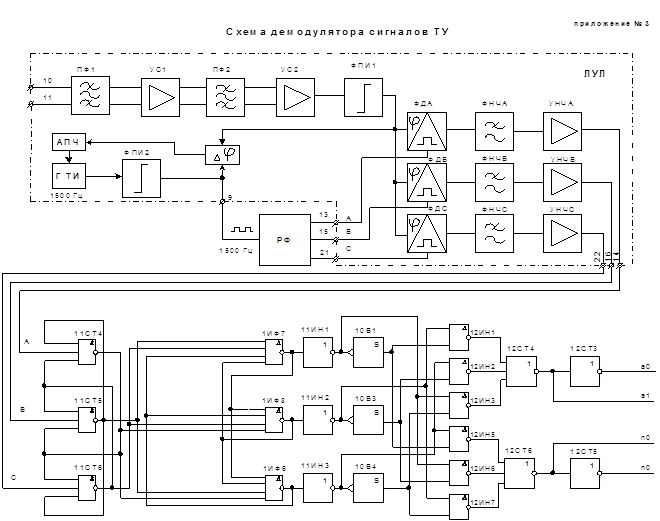 Сигнал ТУ частотой 500 Гц поступает в ЛУЛ (входы 10, 11) (см. приложение № 3) непрерывно и проходит через усилительный каскад, содержащий полосовые фильтры ПФ1 и ПФ2, усилители УС1 и УС2и формирователь прямоугольных импульсов ФПИ1.