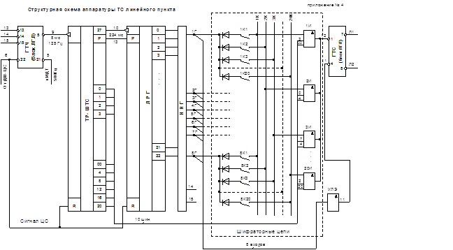 Аппаратура канала ТС линейного пункта предназначается для формирования сигналов телесигнализации. Она состоит из ( см. приложение № 4) из генератора тактовой частоты ГТЧ, расположенного в блоке ЛГЛ; тактового распределителя шифратора сигналов ТС ТР-ШТС; группового распределителя ЛРГ, настроенного посредством перемычек ННГ на передачу сигналов из групп, отведенных данному линейному пункту; шифраторных цепей, образованных выходами распределителей ТР- ШТС и ЛРГ, и логическими элементами 1И- 20И ; генератора сигналов ТС ГТС, находящегося в боке ЛГЛ, и логического элемента УЛЭ, управляющего включением и выключением ГТС.