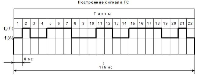 Такты 1(начальный ) и 22 (завершающий ) являются служебными. Остальные такты, каждый из которых несет информацию о состоянии того или иного объекта, являются рабочими. Сигналы ТС в каждом канале передаются двумя частотами, причем более низкая принята в качестве активного импульсного признака (логический символ 1), а более высокая - в качестве пассивного (логический символ 0).