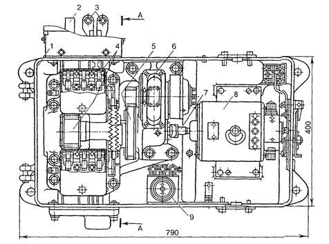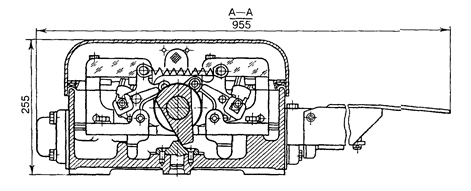 Свободно вращающееся на главном валу зубчатое колесо своим упором заходит в вырез диска главного вала. Шиберная шестерня выполнена как одно целое с главным валом и находится в зацеплении с рабочим шибером. По обе стороны главного вала расположены автопереключатели, которые имеют по две пары неподвижных колодок с контактами и по одному переключающему рычагу с ножами. Стрелка в конце перевода запирается запорными зубьями специального профиля, расположенными на рабочем шибере и шиберной шистерне. Перевод стрелки и ее запирание контролируется двумя контрольными линейками с вырезами, в которые западают концы переключающих рычагов.