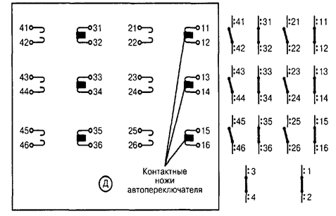 Контактная система электропривода СП-3 показана на рисунке. При любом крайнем положении шибера после его нормального перевода должны быть замкнуты по три пары контактов на контактных колодках, расположенных по обе стороны на основании переключателя.