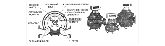 Счетчик состоит из корпуса, ротора, в пазах которого находятся лопасти и устройства преобразования. Внутри ротора находится кулачковый диск специального профиля, к которому прижаты лопасти (через подшипники качения). Корпус выполнен с двойными стенками, в полости между которыми находится жидкость для уравновешивания давления и сохранения постоянного объема внутренней камеры. Счетчик работает по принципу вытеснения (переноса) равных объемов жидкости из входа в выход корпуса.