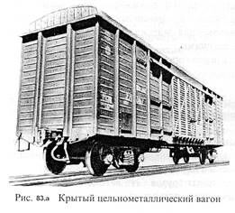 Крытые вагоны (рис. 83,а) предназначены для перевозки грузов, требующих сохранности  и защиты от атмосферных воздействий. Кузов крытого вагона имеет в каждой из боковых стен задвижные двери, по два люка с металлическими крышками.