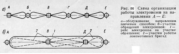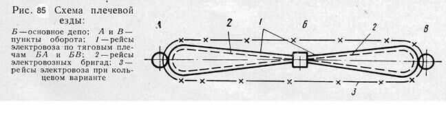 Схема плечевой езды – недостаток – частые отцепки локомотивов от поездов и заходы на территорию депо, вызывающие значительные потери времени. (рис. 85)