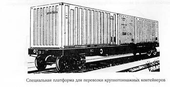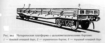 На платформах (рис. 84,б) перевозят длинномерные, громоздкие и тяжеловесные грузы. Их строят с невысокими откидными металлическими бортами, приспособлениями для установки стоек, необходимых при перевозке бревен, досок и т.п. Для перевозки крупнотоннажных контейнеров массой брутто 10, 20 и 30т. используют специальные 4-х осные платформы, оборудованные устройствами для установки и крепления контейнеров.