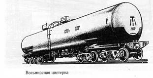 Цистерны строят 4-х осными с объемом котла 72 м3 и 8-и осные (рис.) с объемом котла 134 м3.