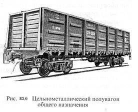 Полувагоны (рис. 83,б) – наиболее распространенный вид вагонов грузового парка. Они служат для перевозки массовых навалочных, сыпучих грузов (уголь, песок, руда, щебень и др.). В полу кузова вдоль боковых стен предусмотрены разгрузочные люки, через которые сыпучий груз самотеком разгружается по обе стороны полувагона. Торцовые двери нужны для загрузки полувагона длинномерными грузами. В эксплуатации на железной дороге используют 4-х осные и 8-и осные полувагоны.