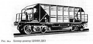 Разновидностью полувагонов являются вагоны – хопперы (рис. 84,а) для перевозки только сыпучих грузов (щебень, гравий, цемент и др.) грузоподъемностью 50т. Хоппер имеет высокие боковые стены, а для перевозки цемента – крышу с загрузочными грузами. Торцовые стены наклонены .к середине вагона, где расположены разгрузочные люки.