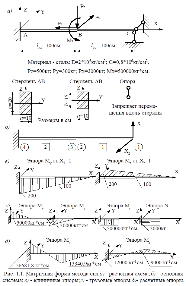 1.1.1. ПРИМЕР РАСЧЕТА ПРОСТРАНСТВЕННЫХ КОНСТРУКЦИЙ С ИСПОЛЬЗОВАНИЕМ МАТРИЧНОЙ ФОРМЫ МЕТОДА СИЛ