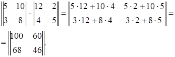 Далее переходим к вычислению коэффициентов канонических уравнений по матричному выражению (1.6), связанному с перемножением матриц. При выполнении матричных операций следует помнить, что матрицы не подчиняются переместительному закону – их нельзя менять местами. Чтобы перемножить матрицу на матрицу нужно, для получения элемента результирующей матрицы, элементы строки первой матрицы умножить на элементы столбца второй матрицы и результаты сложить. Например: