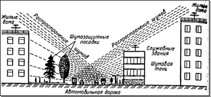 По зарубежным данным, 45% городского шума происходит от наземного транспорта. Схема распространения уличного шума представлена на рис. 4. Шумовые характеристики транспортных потоков, дБА, следующие: скоростные дороги — 87; магистральные и общегородские улицы с непрерывным движением — 85; общегородские с регулируемым движением — 82; магистрали с грузовым движением — 84. Уровень шума от транспортного потока; интенсивностью до 100 тыс. ед./сут составляет 90—05 дБА.