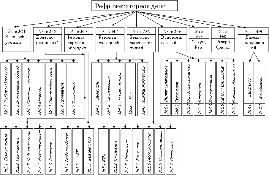 Примерные структурные схемы пассажирского, грузового и рефрижераторного вагонных депо приведены на рисунках 1.2, 1.3 и 1.3 соответственно.