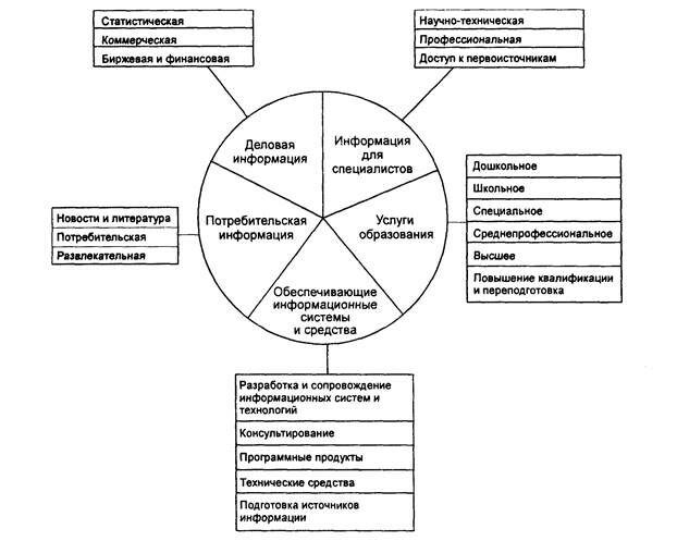 Состав инфраструктуры[13] информационного рынка представлен на рис.1. Выделяют пять секторов рынка информационных продуктов и услуг.