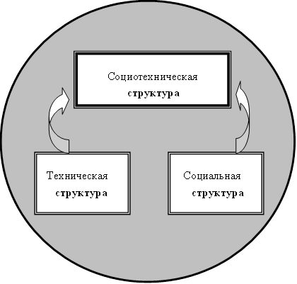 Социотехническая структура – это система рабочих мест, объединяющая работников пространственно и в трудовой взаимосвязи. Она интегрирует в себе жесткую техническую и гибкую социальную структуры. Таким образом, организация не является чисто материальным, или чисто духовным явлением.