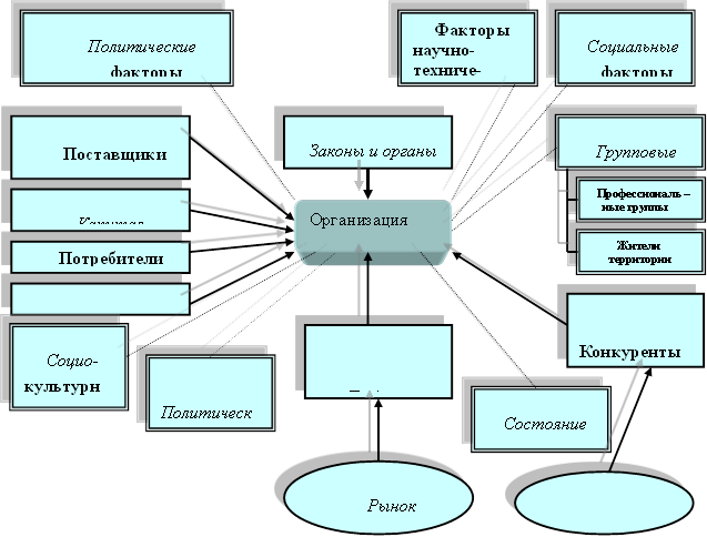 Внешняя среда организации – это совокупность внешних факторов, оказывающих воздействие на неё, или которые она должна учитывать в своей деятельности. Организация взаимодействует со средой, чтобы получать ресурсы в обмен на продукты своей деятельности. Внешняя среда признается большинством современных теорий управления важнейшей характеристикой функционирования организации.