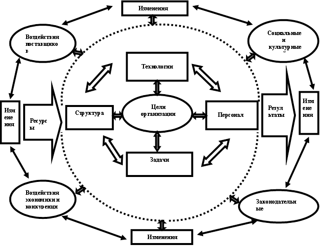 Организация представляет собой открытую, сложную социально-экономическую систему, которая активно взаимодействует с окружающей средой. Получая из вне ресурсы, организация преобразует их на основе соответствующих технологий в требуемые конечные результаты.