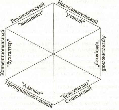 Джон Голланд исследовал множество фирм в США и Цен тральной Европе и на основе полученных результатов предложил теорию выбора карьеры. По его мнению, выбор есть выражение личности, а не случайность (шанс). Он считает, что достижения и карьерные успехи зависят от соответствия между личностью и работой. Предложенная им классификация типов личности получила название «Шестиугольник Голланда» (рис. 4.3).