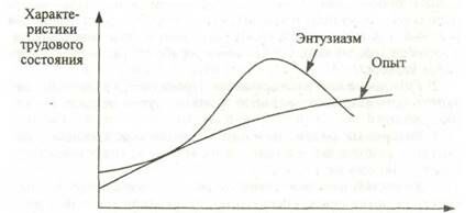 Замечено, что с приобретением опыта уровень энтузиазма растет, но до определенного момента (4-5 лет работы), после чего резко падает.